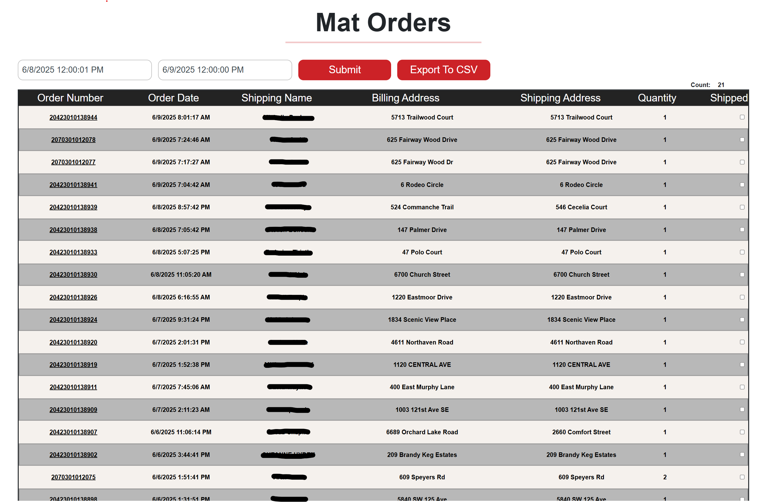 This page tracks shipping for our mat orders. This includes a button that exports the data to a CSV.